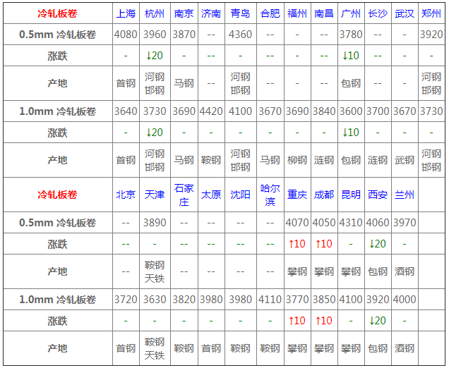 4月29日冷軋板卷價格:弱穩整理; 今日市場弱勢震蕩,當前大背景下,華南地區冷軋鍍鋅板卷中小加工廠出口訂單受影響,大部分貿易商海外訂單已被取消,終端生產暫停,需求不容樂觀,就目前鍍冷價差分析,需求矛盾仍是關鍵,而二季度也難以改善。綜合考慮,故預計短期冷軋卷板價格出貨不改。