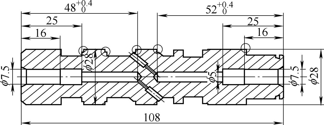 我公司生產(chǎn)的轉(zhuǎn)向器控制閥芯(見(jiàn)圖1),是動(dòng)力轉(zhuǎn)向器中的重要零件,材料為GCr15,其作用是通過(guò)軸向前后移動(dòng),接通油缸左、右油腔,進(jìn)入油缸的高壓油推動(dòng)活塞本體軸向運(yùn)動(dòng),活塞本體的齒條帶動(dòng)垂臂軸的主齒作徑向正、反轉(zhuǎn)動(dòng),通過(guò)轉(zhuǎn)向垂臂、橫拉桿,實(shí)現(xiàn)汽車(chē)左右轉(zhuǎn)向。